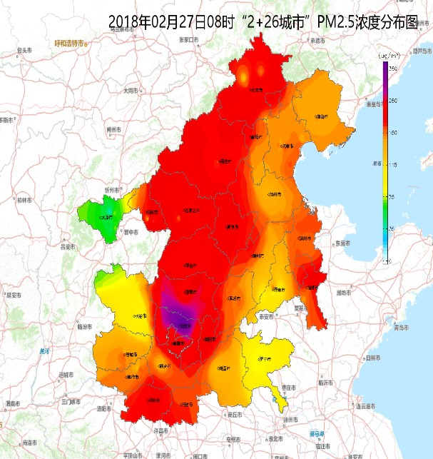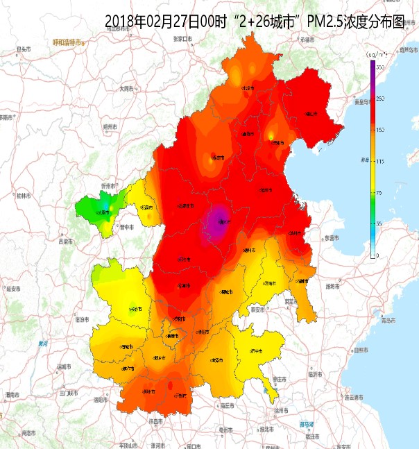 圖1 “2+26”城市2月27日PM2.5濃度分布圖