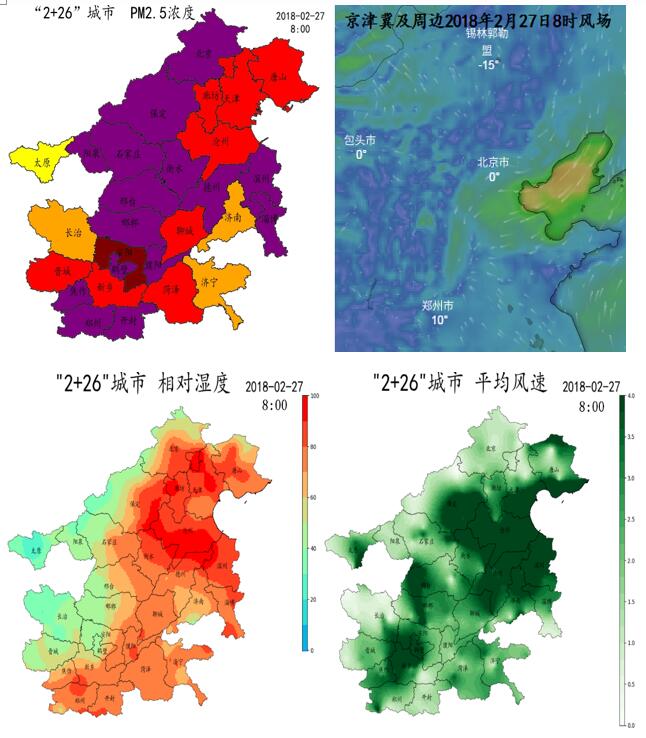 2018年2月26日起,京津冀及周邊地區(qū)經(jīng)歷了一次重污染過程,主要集中在河北南部、河南北部和山東西北部地區(qū),其中滄州、衡水、邢臺、邯鄲、安陽等城市污染較嚴重。截止2月27日8時,京津冀及周邊地區(qū)“2+26”城市有23個城市PM2.5小時濃度先后超過150微克/立方米(日均值重污染標準);其中,有5個城市PM2.5小時濃度超過250微克/立方米(日均值嚴重污染標準)。區(qū)域內(nèi)PM2.5小時濃度最高值出現(xiàn)在安陽,2月27日7時達到408微克/立方米;北京市PM2.5小時濃度過程高值同樣出現(xiàn)在2月27日7時,達到215微克/立方米(圖1)。