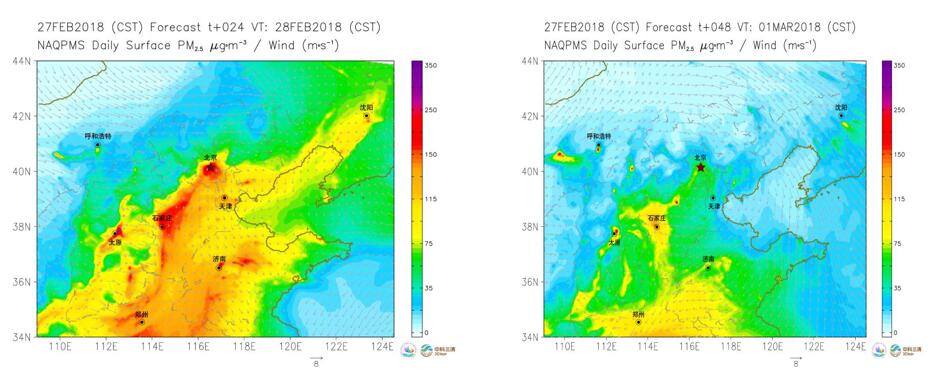 因東北高壓系統(tǒng)南下受阻,27日白天冷空氣過程顯著偏弱,京津冀中部污染過程預計將持續(xù)至28日。受區(qū)域性弱風、高濕及逆溫等不利氣象條件影響,京津冀中南部、山西南部、山東西部和河南北部可能出現(xiàn)中至重度污染過程,影響范圍主要包括北京、天津、石家莊、保定、衡水、邢臺、邯鄲、晉城、濟南、德州、淄博、聊城、鄭州、安陽、鶴壁、焦作、新鄉(xiāng)、濮陽等城市,部分城市可能達到嚴重污染,PM2.5小時濃度峰值可能達到或超過350微克/立方米。28日夜間至3月1日凌晨,受冷空氣過程影響,包括北京、天津在內(nèi)的京津冀中部城市群空氣質(zhì)量有望改善(圖9)。