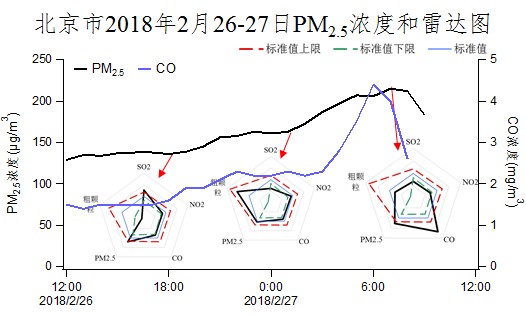 圖5 北京市2月26-27日雷達圖及東部通道CO濃度變化