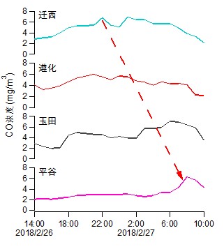本次重污染過程中,從唐山到北京一線的CO濃度伴隨PM2.5存在明顯的快速增加,北京2月27日4時之前CO維持在2.2-2.3 mg/m3,5-9時迅速上升至2.6-4.4 mg/m3。從遷西-遵化-玉田-平谷(沿主導風向)各監(jiān)測點位的時序變化也可以看出,CO沿傳輸方向峰值明顯呈依次出現(xiàn)的特征。污染物特征雷達圖也顯示,北京在此次污染過程中CO呈現(xiàn)相對很高的特征。以上證據(jù)表明,北京市的污染明顯受到了來自東部地區(qū)的傳輸影響(圖5)。