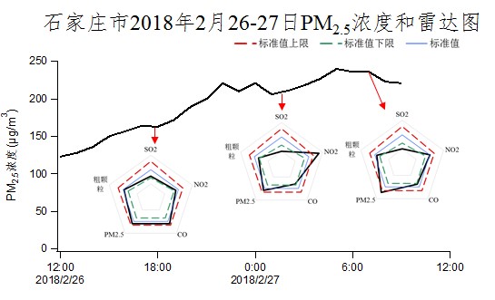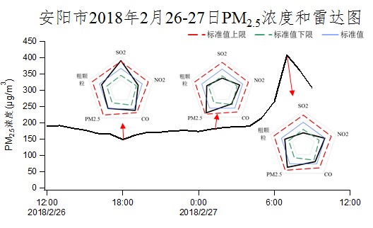 圖7 石家莊、安陽2月26-27日PM2.5濃度和雷達圖