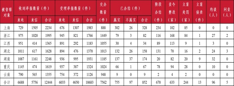 截至5月20日晚20:00,各督察組共收到群眾來電、來信舉報12444件,受理有效舉報10683件,經(jīng)梳理合并重復(fù)舉報,累計向被督察地方轉(zhuǎn)辦7562件;被督察地方已辦結(jié)或階段辦結(jié)1522件,其中立案處罰244家;立案偵查13件;約談黨政領(lǐng)導(dǎo)干部96人,問責(zé)黨政領(lǐng)導(dǎo)干部5人。